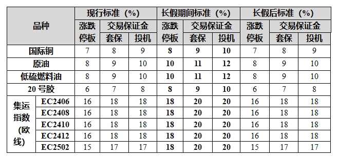 上期能源通知称,4月29日收盘结算时起,国际铜、20号胶期货合约的涨跌停板幅度调整为8%,套保交易保证金比例调整为9%,投机交易保证金比例调整为10%;原油、低硫燃料油期货合约的涨跌停板幅度调整为10%,套保交易保证金比例调整为11%,投机交易保证金比例调整为12%;集运指数(欧线)期货EC2406、EC2408、EC2410、EC2412、EC2502合约的涨跌停板幅度调整为18%,交易保证金比例调整为20%。5月6日交易后,自第一个未出现单边市的交易日收盘结算时,所有期货合约的涨跌停板幅度和交易保证金比例恢复至原有水平。