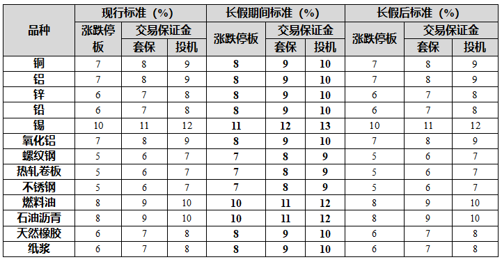 根据上期所通知,自4月29日收盘结算时起,螺纹钢、热轧卷板、不锈钢期货合约的涨跌停板幅度调整为7%,套保交易保证金比例调整为8%,投机交易保证金比例调整为9%;铜、铝、锌、铅、氧化铝、天然橡胶、纸浆期货合约的涨跌停板幅度调整为8%,套保交易保证金比例调整为9%,投机交易保证金比例调整为10%;燃料油、石油沥青期货合约的涨跌停板幅度调整为10%,套保交易保证金比例调整为11%,投机交易保证金比例调整为12%;锡期货合约的涨跌停板幅度调整为11%,套保交易保证金比例调整为12%,投机交易保证金比例调整为13%。5月6日交易后,自第一个未出现单边市的交易日收盘结算时,所有期货合约的涨跌停板幅度和交易保证金比例恢复至原有水平。