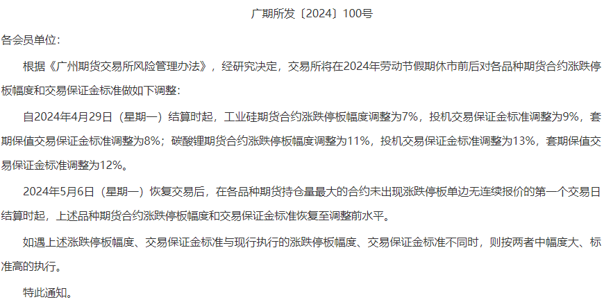 广期所自4月29日结算时起,工业硅期货合约涨跌停板幅度调整为7%,投机交易保证金标准调整为9%,套期保值交易保证金标准调整为8%;碳酸锂期货合约涨跌停板幅度调整为11%,投机交易保证金标准调整为13%,套期保值交易保证金标准调整为12%。5月6日恢复交易后,在各品种期货持仓量最大的合约未出现涨跌停板单边无连续报价的第一个交易日结算时起,上述品种期货合约涨跌停板幅度和交易保证金标准恢复至调整前水平。
