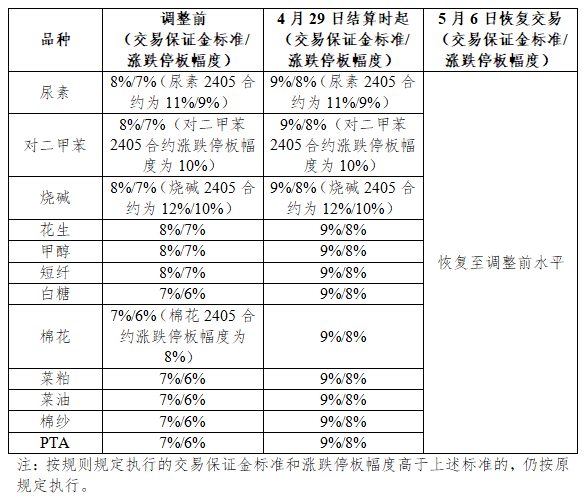 根据郑商所通知,自4月29日结算时起,白糖、棉花、菜粕、菜油、棉纱、花生、PTA、甲醇、尿素、短纤、对二甲苯及烧碱期货合约的交易保证金标准为9%,涨跌停板幅度为8%。其中,尿素期货2405合约的交易保证金标准为11%,涨跌停板幅度为9%;对二甲苯期货2405合约的涨跌停板幅度为10%;烧碱期货2405合约的交易保证金标准为12%,涨跌停板幅度为10%。5月6日恢复交易后,自品种持仓量最大的合约未出现涨跌停板单边市的第一个交易日结算时起,上述品种期货合约的交易保证金标准和涨跌停板幅度恢复至调整前水平。